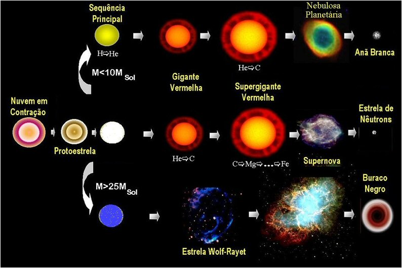 - Ou, se for massiva, explodir em uma supernova e dar origem a uma estrela de nêutrons ou um buraco negro.